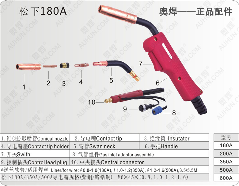 松下180/200A氣保焊槍(氣冷式)適用于:150A-250A氣保機,哲載率60%時焊機電流200A,使用焊絲直徑:0.8-1.2MM。相關(guān)產(chǎn)品:保護套,導(dǎo)電嘴,連桿,彎管,絕緣螺母等。